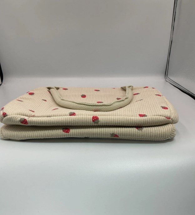 beige corduroy insulated lunch bag with a strawberry pattern View Watchlist >