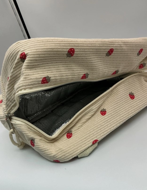 beige corduroy insulated lunch bag with a strawberry pattern View Watchlist >