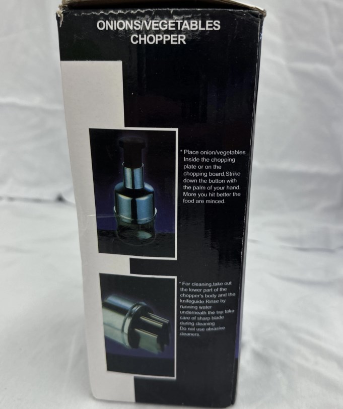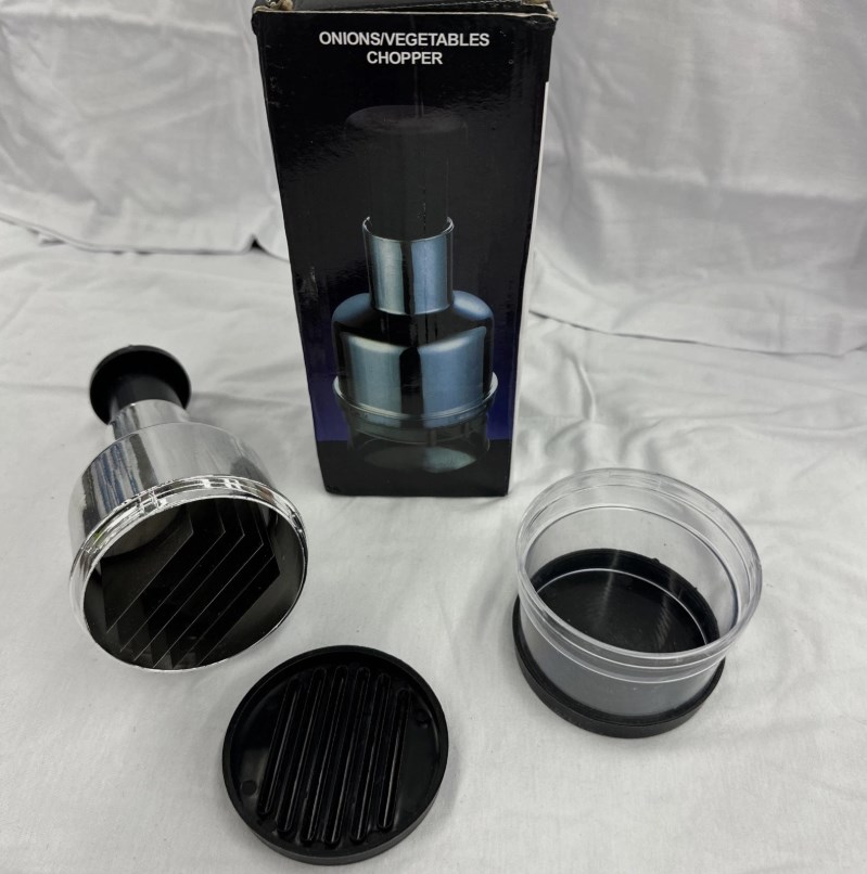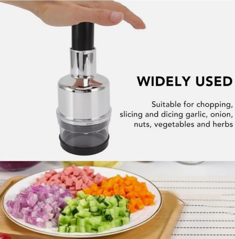 The Onion Vegetable Chopper is a manual slicer made of stainless steel, designed specifically for chopping vegetables, particularly onions. It features a simple compressor making method, making it easy to use for quick and efficient food preparation. The set includes one chopper, perfect for slicing onions with ease and precision for various recipes. This handy tool is ideal for home cooks looking to streamline their food chopping process, especially for dishes that require diced onions.