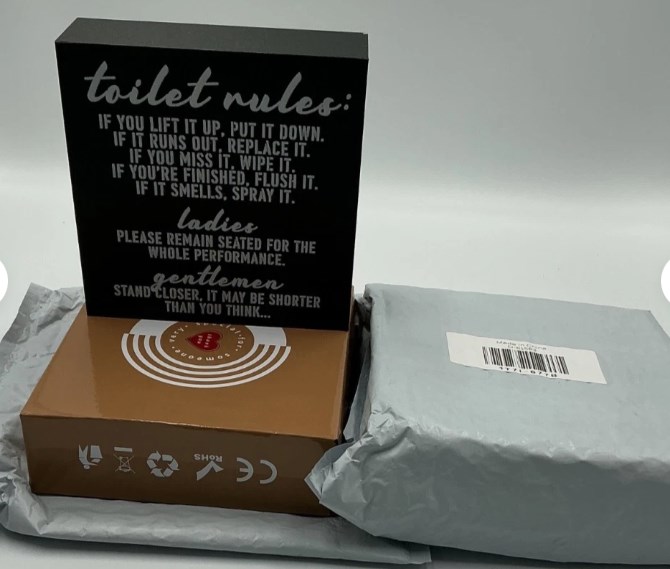 The product is a set of 2 toilet rules signs, designed to be displayed in a bathroom to provide guidance and reminders about proper behavior and etiquette. These signs feature a simple and straightforward design, making them easy to understand and comply with. Perfect for adding a touch of decor to the bathroom while also serving as a helpful reminder for guests.